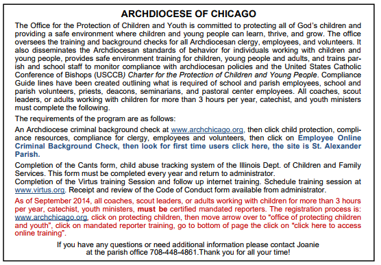 Today, Father Marty Michniewicz continues to foster the message of Christ as the pastor. We serve 250 students, in grades preschool through eighth. Our school has continued to provide an excellent academic, religious and moral foundation for our children. We strive to offer a curriculum meeting the needs of the whole child — spiritually, academically, socially and physically — and to work toward each student’s realization of his/her potential in these areas. In cooperation with parents, the school fosters an atmosphere of love, respect and service where the message of Christ is taught and lived and community worship is an integral part of the religious education program. Through their Catholic education, the students learn responsibility and an appreciation of their family, school, parish, community and world. This is the mission of St. Alexander School.