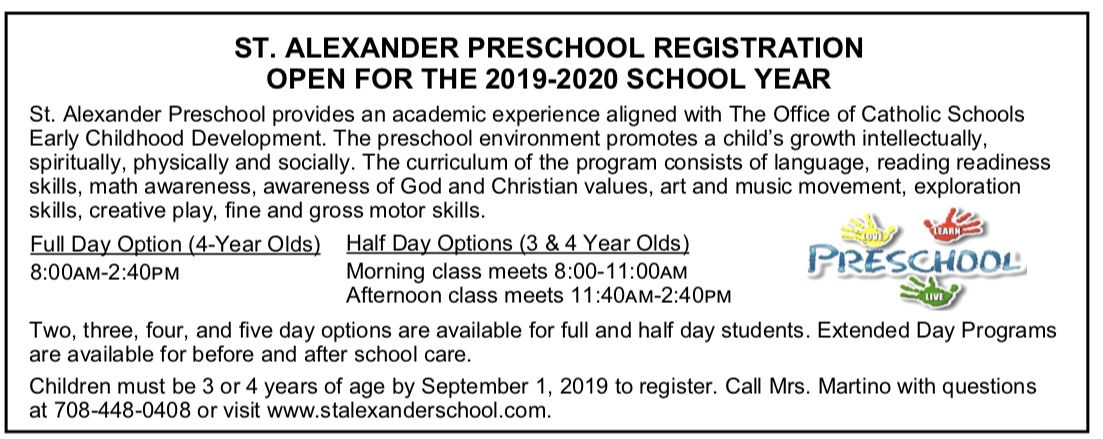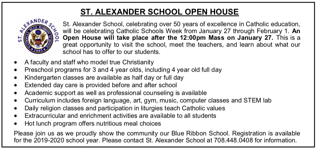 To arrange a visit, please call (708) 448-0408. Or send us an e-mail at info@stalexanderschool.com. You can also visit us online at www.StAlexanderSchool.com.