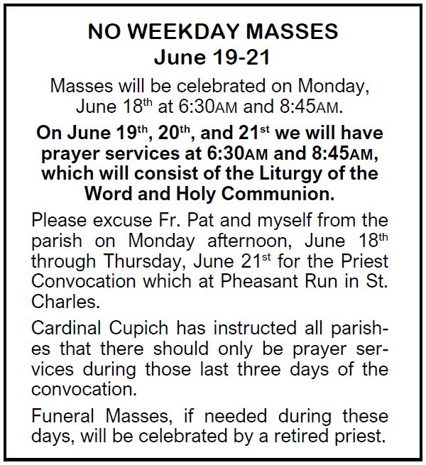 Weekday Masses from St. James Chapel: Daily Masses will be available on our website, archchicago.org, beginning at 10 a.m. each weekday. Those Masses will remain available for viewing until the next online Mass is celebrated. Also available on our YouTube channel and on the Archdiocese of Chicago Facebook page.