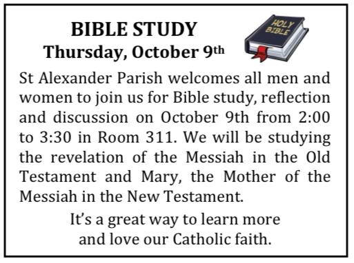 The Bible Study Ministry meets every second Thursday of the month in Room 311 from 2:00-2:30 p.m. If you have questions about this ministry, please contact the parish office at 708-448-4861.