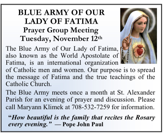 The Blue Army of Our Lady of Fatima, also known as the World Apostolate of Fatima, is an international organization of Catholic men and women. Our purpose is to spread the message of Fatima and the true teachings of the Catholic Church. The Blue Army meets once a month at St. Alexander Parish for an evening of prayer and discussion. For more information please call Maryann Klimek at 708-532-7259.