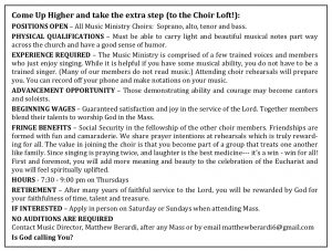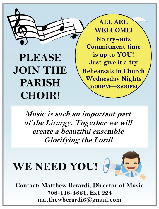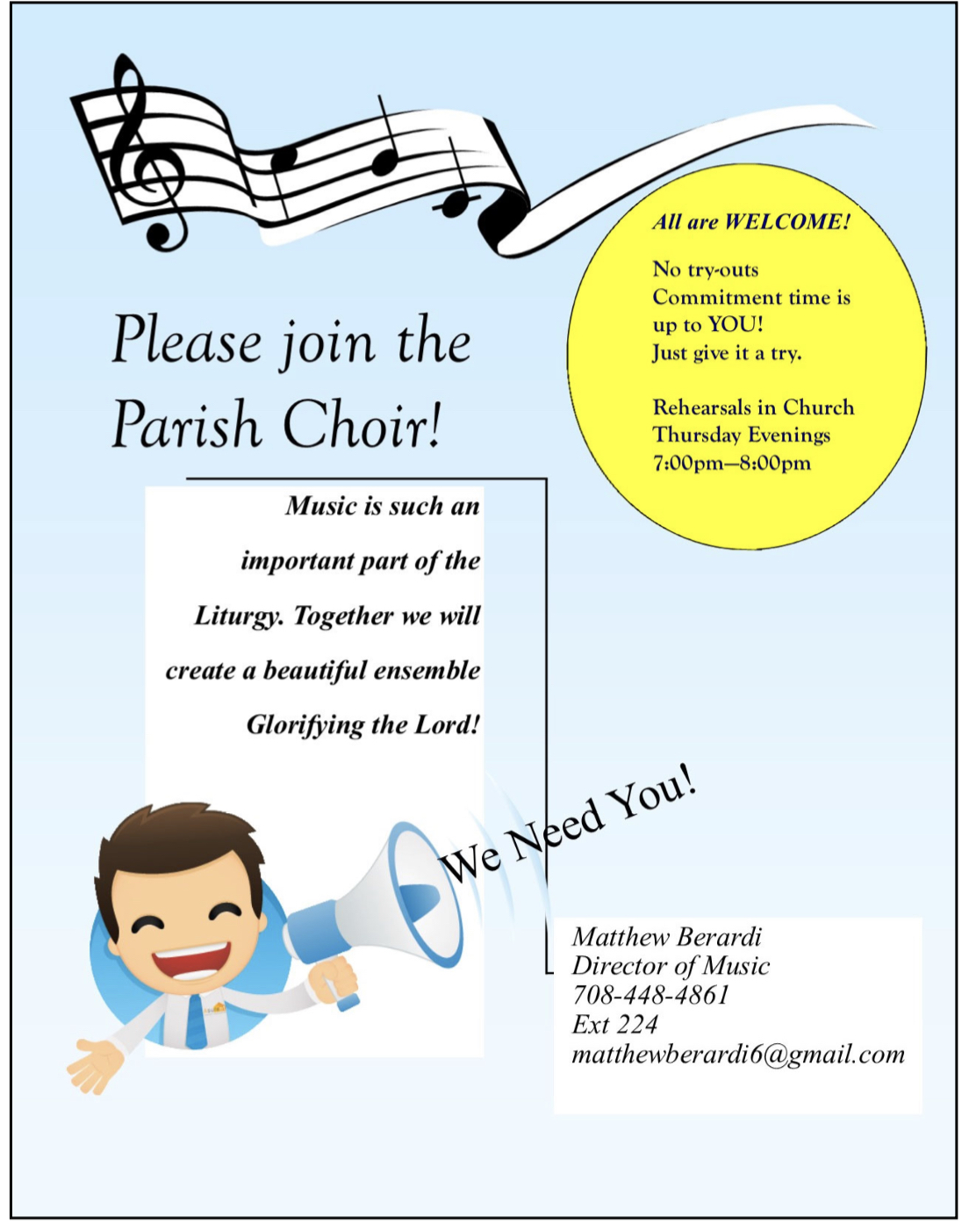 If your interested in joining the children’s or adult choir please call our Director of Music, Matthew Berardi, at 708-448-4861 ext. 224 or email matthewberardi6@gmail.com.