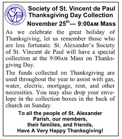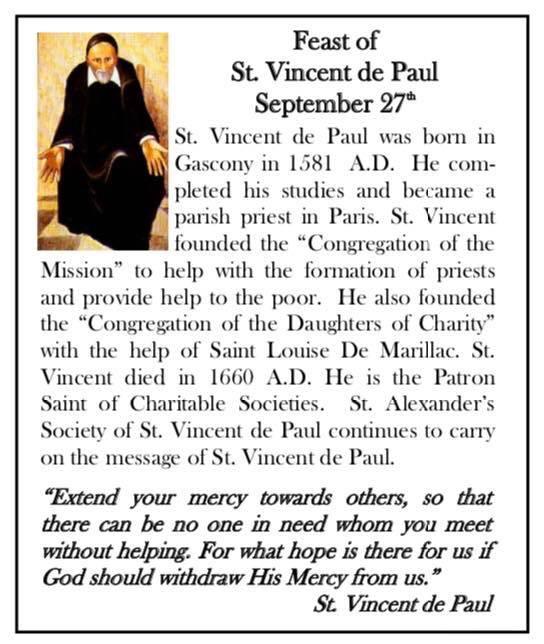Who are the St. Vincent de Paul St. Alexander Conference Vincentians? We are a group of volunteers, all parishioners of St. Alexander who inspired by the Gospels, offer assistance to the needy and suffering. We are of various ages, different backgrounds but the one thing in common is a desire to help those who are struggling.